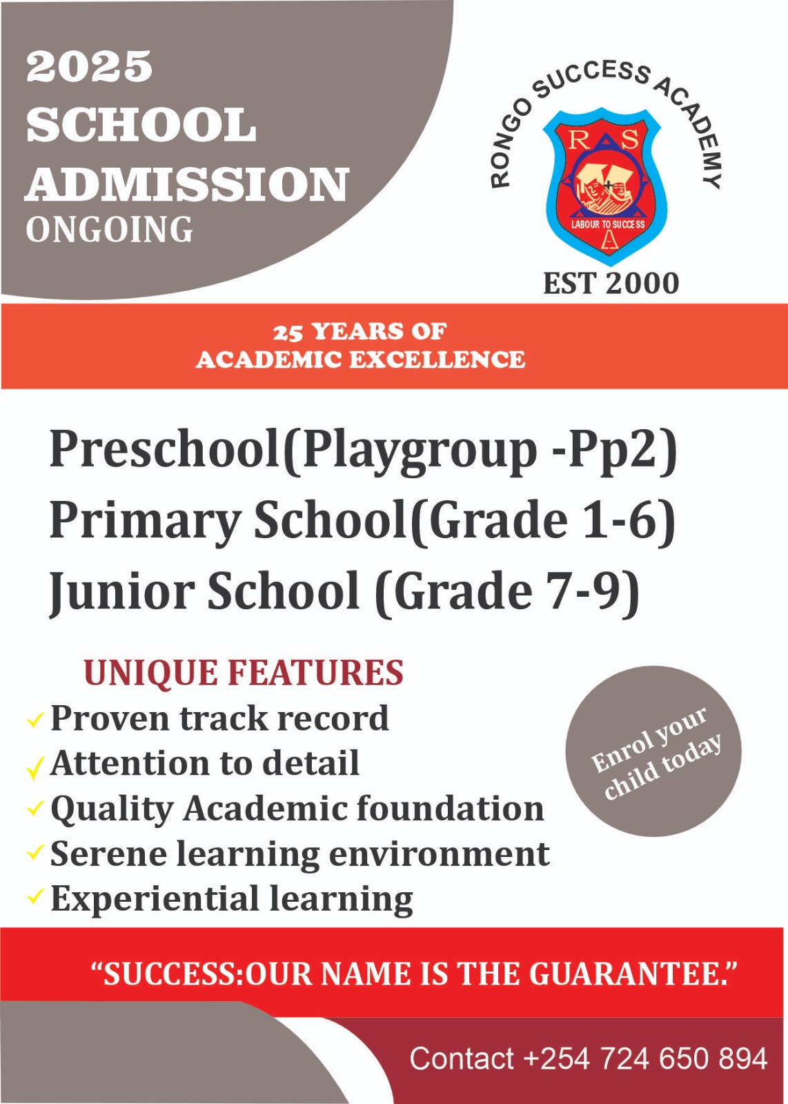 Rongo Success Academy is a leading educational institution renowned for its unwavering commitment to academic excellence, discipline and holistic development. The school provides a conducive learning environment that inspires students to reach their fullest potential.